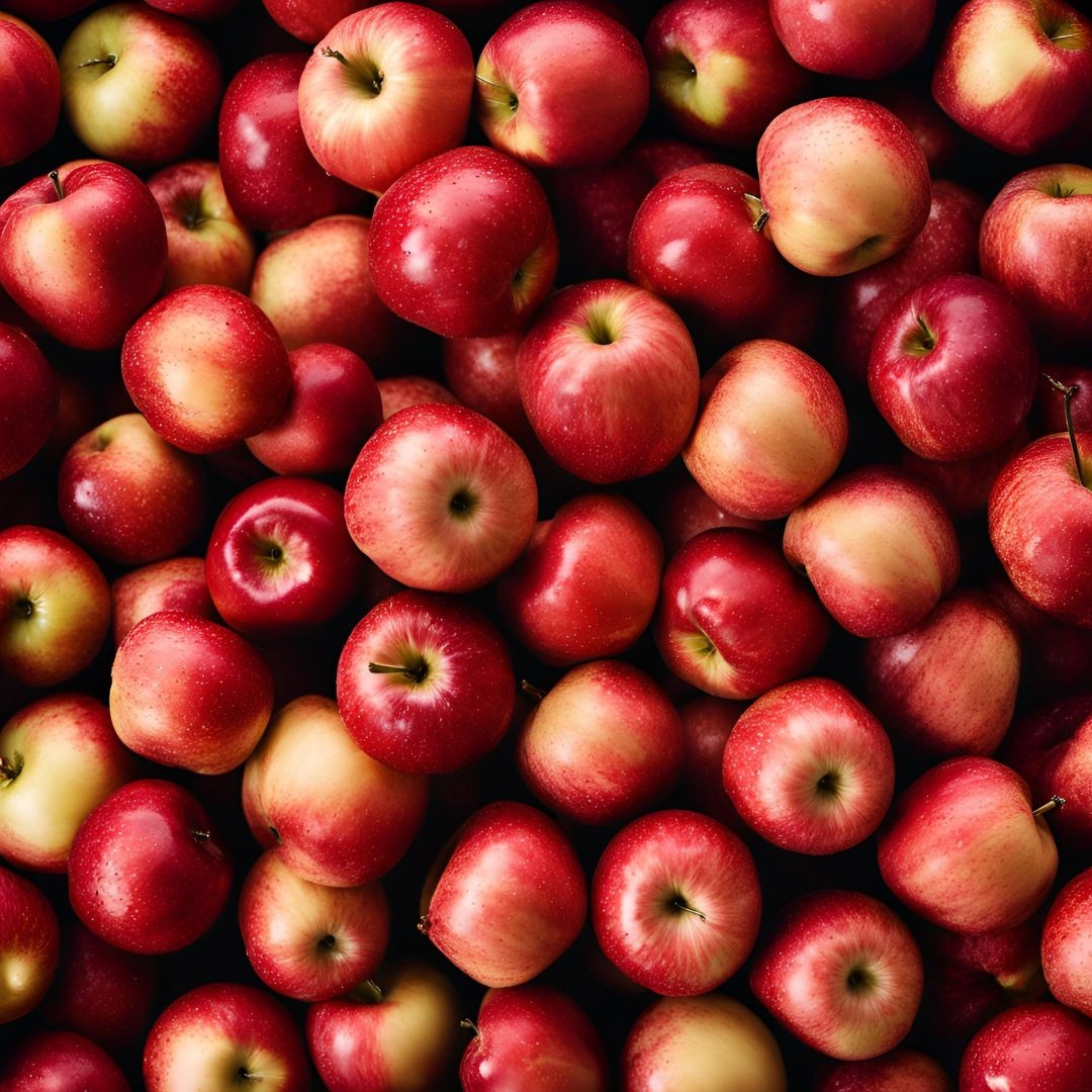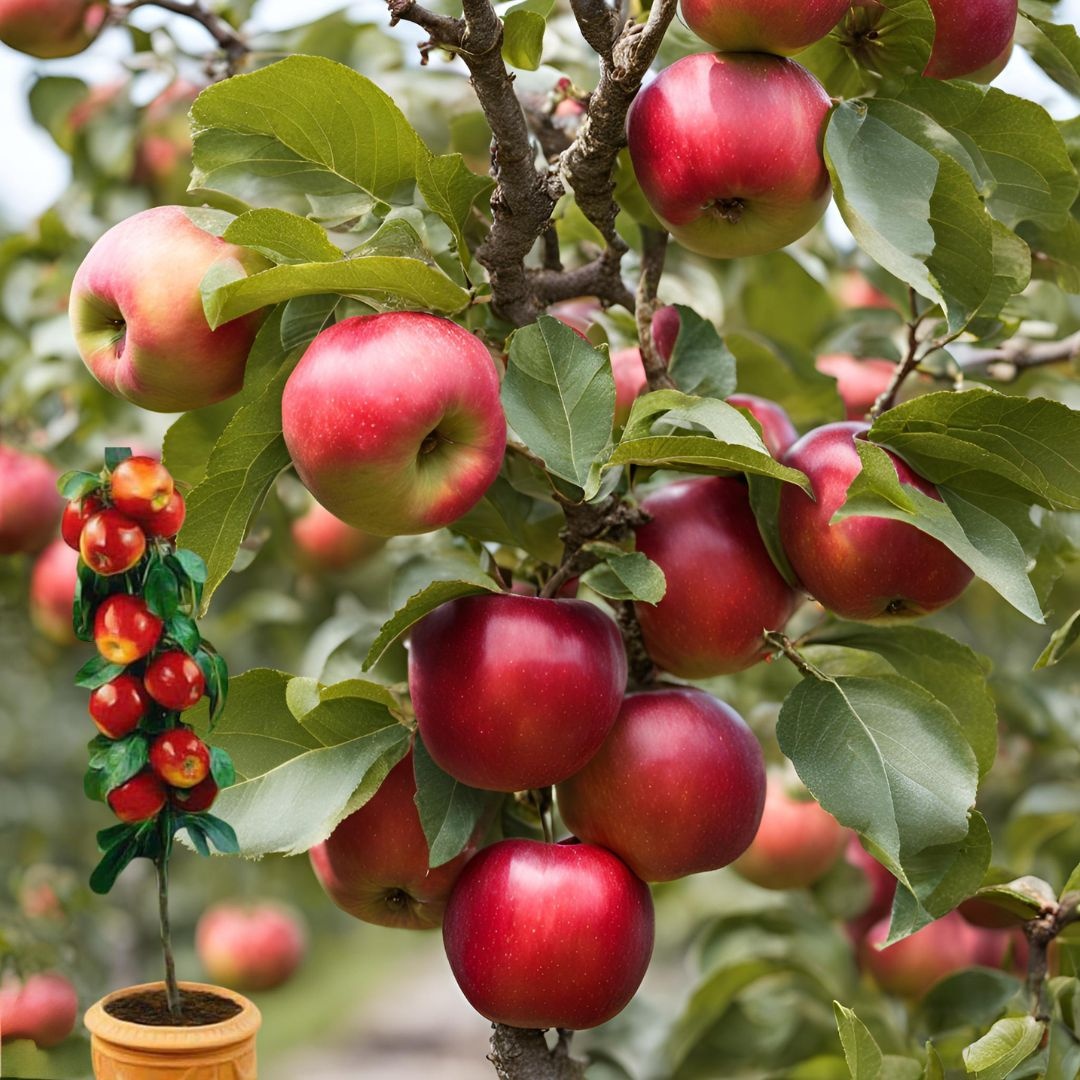 • Fructe: Mere mari, dulci, cu pulpă crocantă și aromată, de culoare roșu intens